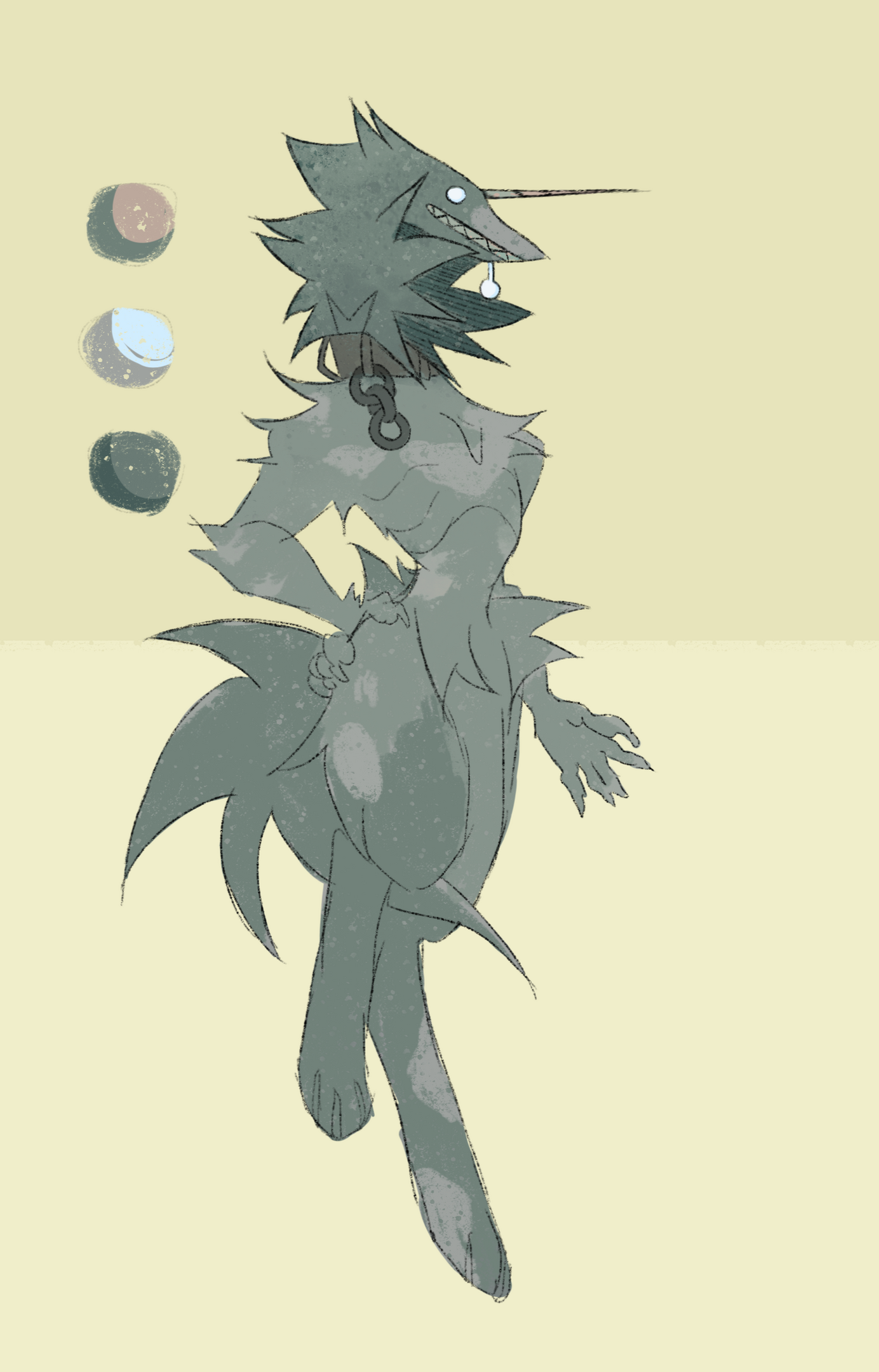 A themed color plucker and side environment image, with a side view sketch of the character over the environment image unless requested to move the sketch, with a lightly shaded character.